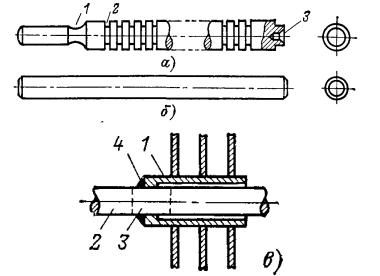 Оси конденсаторов изготовляют из стали, латуни, инвара и радиотехнической керамики, ультрафарфора и стеатита. Для устранения прогибов и скручивания диаметр оси выбирают достаточно большим, от 5 до 10 мм. Крепление ротора может быть произведено пайкой, задавливанием, напрессовкой или при помощи винтов. Конфигурация металлической оси определяется способом крепления роторных пластин (рис. 2.34).
