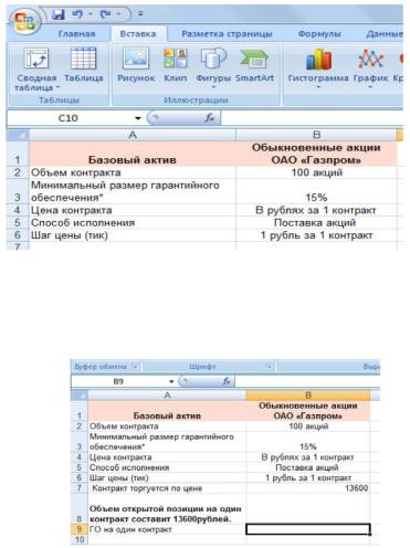 ВExcel откроем чистый лист, внесем данные спецификации фьючерсного контракта ПАО «Газпром», как показано на рис. 28.
