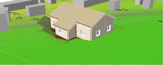 1. Analyzing the relief of an area and choosing the most optimal one as a building location. For that purpose, a toposurface is fragmented into segments according to its orientation to the north, south, etc (considering the distance to the objects surrounding the area, passageways and urbanplanning constraints) and an extra analysis of its relief is conducted. The results of the analyses performed by means of an algorithm are a point of a future building location (Fig. 7).