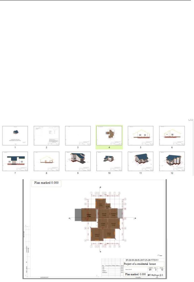 As part of the first operation following the design of volumetric and spatial solutions of the task, certain sheet samples are created. At this stage of the project development, there is only “A Project Sketch” where the following set of sheets is created: a title page, a short explanation note, floor plans (the number varies and changes dynamically), facades of a building, two cuts and general view shots (Fig. 3).