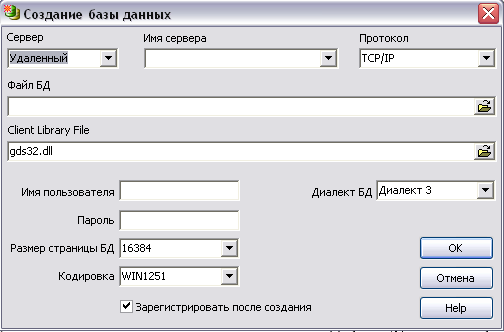 В поле Имя пользователя (рис. 3.3) вводят имя пользователя (например, SYSDBA), а в поле Пароль - пароль (например, masterkey). Необходимо оставить нетронутым флажок «Зарегистрироваться после создания» и подтвердить создание базы данных, нажав кнопку «ОК». После подтверждения создания базы данных открывается окно регистрации, где можно изменить тип сервера, версию сервера и добавить необходимое описание базы данных, затем нажимают кнопку «Register» (рис. 3.5).