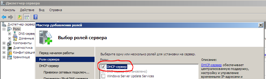 Далее, выберите ту роль, которую хотите установить DHCP –сервер и нажмите Далее.