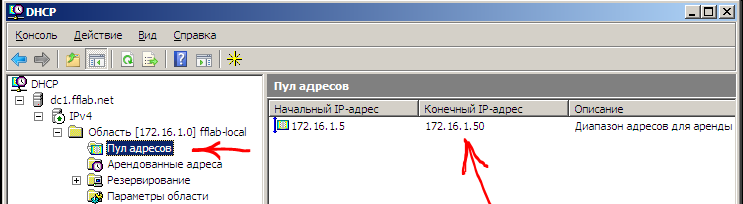 Запишите в рабочую тетрадь параметры DHCP сервера, отображаемые с помощью консоли mmc.