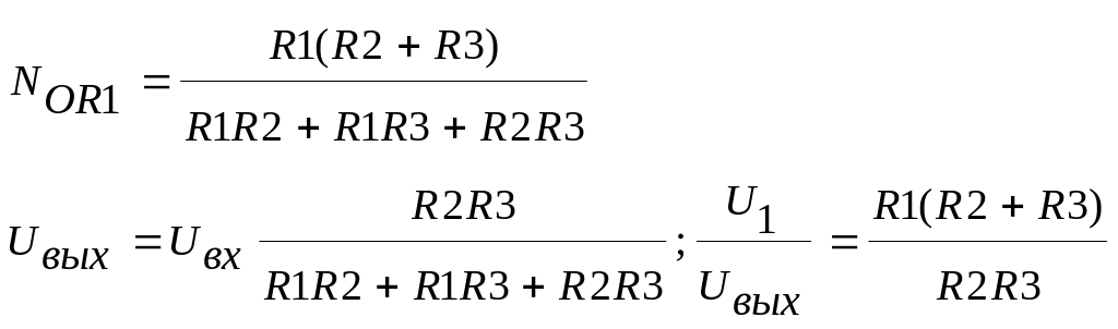 Выходное напряжение Uвых найдем решением системы из двух уравнений, составленных на основании второго закона Кирхгофа для контуров Uвх ,R1, R2, R3 и Uвых , R2, R3 .