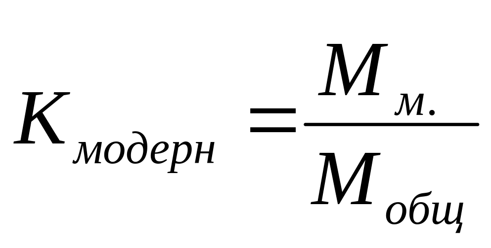 Обновление машинного парка может осуществляться и за счёт модернизации. При анализе обновления парка строительных машин за счёт модернизации подсчитываются следующие показатели.