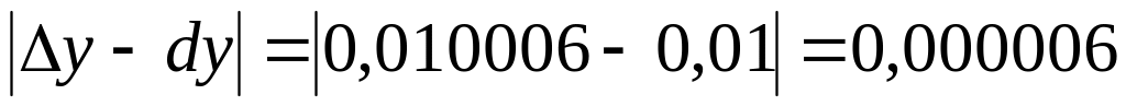 Посмотрим, какую погрешность допустили, вычислив дифференциал функции вместо ее приращения. Для этого найдем :