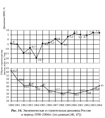 Обозначенные положения представляют определенный интерес при рассмотрении динамики ВВП, отражающей эффективность национальной экономики, и темпов жилищного строительства России в 1990-2004 гг. (рис. 16).