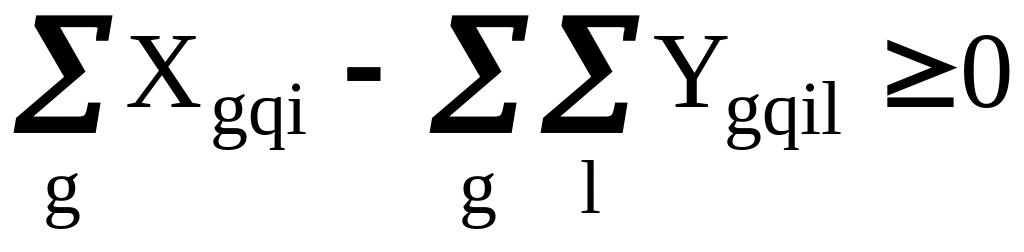 индексы - s – номер применяемого сырья, s = 1, …, S; r – источник s-го сырья, r = 1, …, R; g – номер взаимозаменяемого продукта, g = 1, …, G; q – номер назначения продукта, q = 1, …, Q; i – номер завода, i = 1, …, I; l – номер потребителя, l = 1, …, L; переменные - Xgqi – объемы производства g-го взаимозаменяемого продукта q-го назначения на i-том заводе на m –том уровне; Ysri – объемы перевозок s-того сырья из r-го источника i- му заводу; Ygqil – объемы перевозок g- го взаимозаменяемого продукта q-го назначения, выпущенного на i-ом заводе для l-го потребителя; показатели - Csri – стоимость транспортирования единицы s-го сырья из r-го источника, включая оптовую цену сырья на i-ый завод; Cgqi – стоимость производства единицы g-го взаимозаменяемого продукта q- го назначения на i-ом заводе; Cgqil – стоимость транспортирования единицы g-го продукта q-го назначения с i-го завода l-му потребителю.