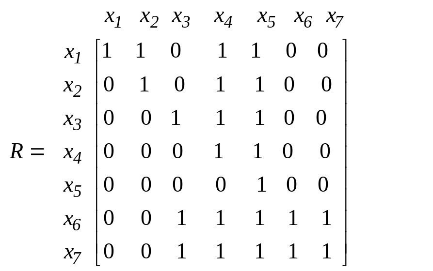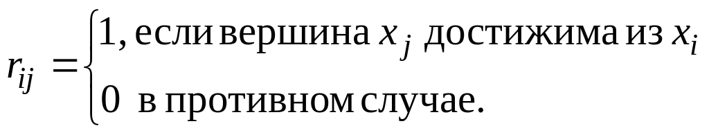 Множество вершин R(xi) графа G, достижимых из заданной вершины xi, состоит из таких элементов xj, для которых (i, j)-й элемент в матрице достижимостей равен 1. Считают, что каждая вершина достижима из себя самой с помощью пути длины 0, поэтому все диагональные элементы в матрице R равны 1.