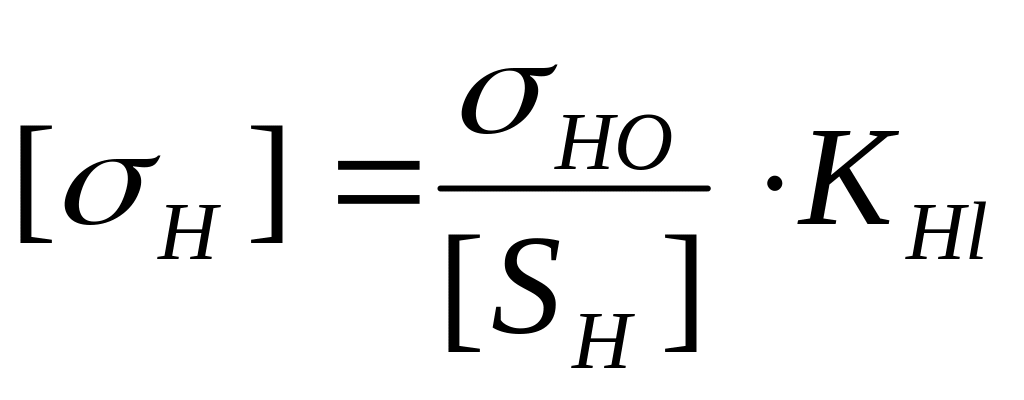 где HO – предел контактной выносливости рабочих поверхностей зубьев, соответствующий базе испытаний (числу циклов перемены напряжений); [SH] – допускаемый коэффициент безопасности, равный [SH]=1,1 при однородной структуре материала (нормализация, улучшение, объемная закалка) и [SH]=1,2 при неоднородной структуре (поверхностная закалка, цементация, азотирование); KHl – коэффициент долговечности, учитывающий влияние срока службы и режима нагрузки: