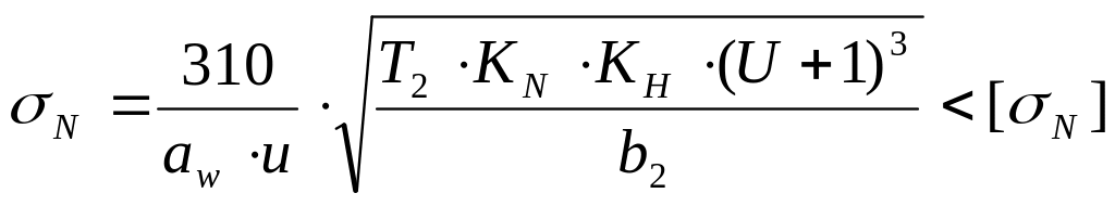 где N и [ N] – расчетное и допускаемые контактные напряжения, Н/мм2; Т – Нмм; aw и b2 – мм.