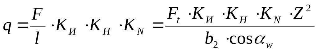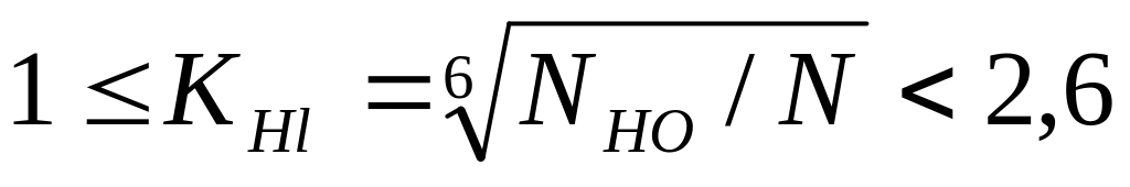 где KИ, KH, KN – коэффициенты нагрузки, учитывающие соответственно распределение нагрузки между зубьями (для прямозубых KИ = 1), неравномерность распределения нагрузки по ширине зубчатого венца и дополнительные динамические нагрузки; l – суммарная длина контактных линий, зависящая от коэффициентов торцевого перекрытия и ширины венца колес b2 (при однопарном зацеплении) и 2b2 (для двухпарного зацепления).
