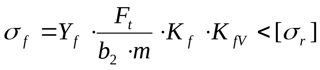 где f и [f] – расчетное и допускаемое напряжение изгиба, Н/мм; Ft – окружная сила; m – модуль, мм; Yf – коэффициент формы зуба, безразмерная величина, зависящая от числа зубьев Z; Kf, KfV – коэффициенты, учитывающие неравномерность распределения нагрузки по ширине зубчатого венца и дополнительной динамической нагрузки в зацеплении.