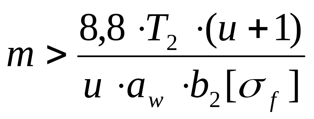 Модуль зубьев m определяют расчетом на изгиб исходя из межосевого расстояния aw, полученного из условия контактной прочности. В этом случае, заменяя Ft=2T2/d2, где d2=2awu/(u+1), получим для модуля следующее выражение: