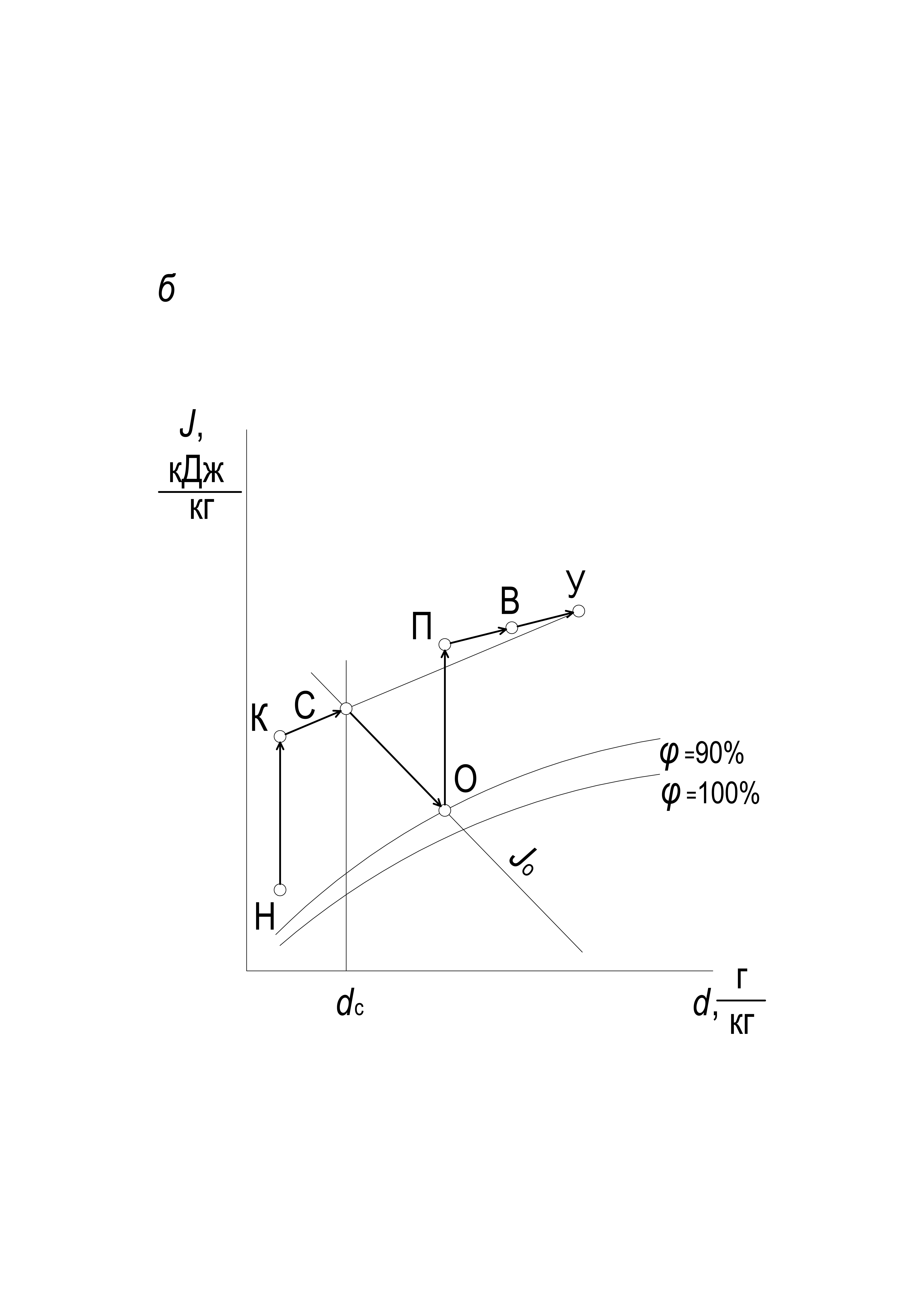 − определение положения точки С (т.е. состояния воздуха после смешивания наружного воздуха, прошедшего нагрев в первом воздухонагревателе ВН1 с уходящим из помещения воздухом), расположенной на пересечении изоэнтальпы JО с линией dС; численное значение dС вычисляют по формуле
