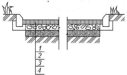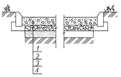 Детские площадки: 1 − гравийный отсев 50 мм; 2 − известковый щебень 100 мм; 3 − песок 100 мм; 4 − утрамбованный грунт |