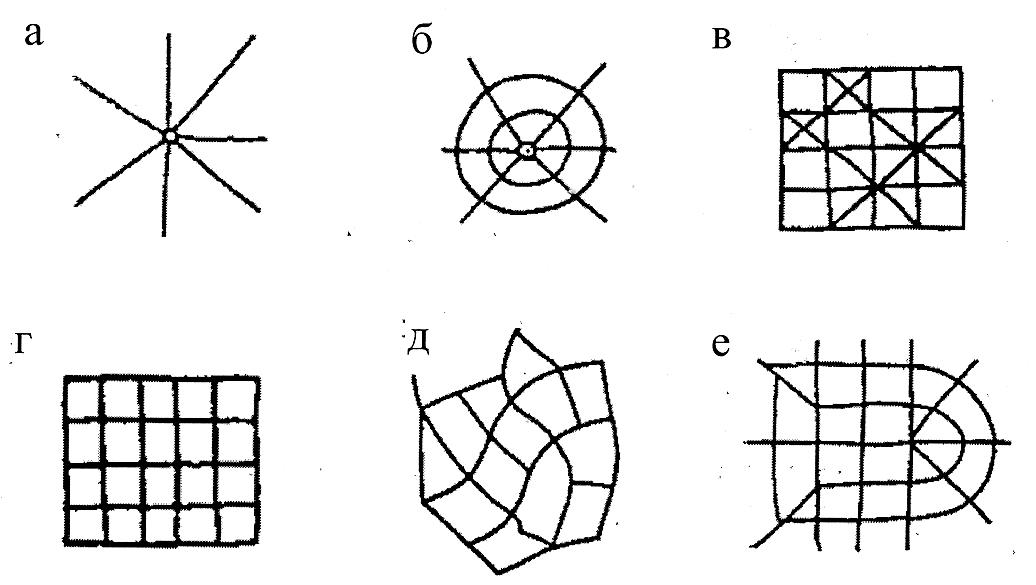 Размещение крупных объектов общественно-деловой застройки на территории города является причиной возникновения крупных транспортных потоков. Это предопределяет общую систему магистральных улиц и площадей, создает каркас планировочной структуры города. Система расположения улиц может быть разнообразной (рис.1.1).
