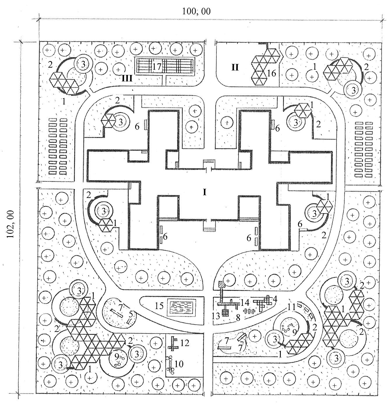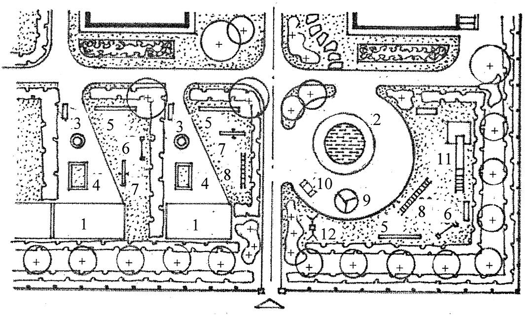 Элементы благоустройства: 1 – площадка для ясельной группы; 2 – площадка
