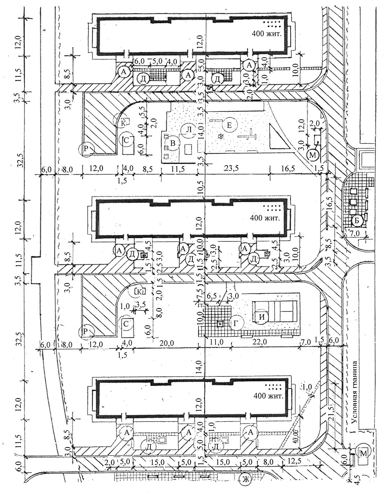 Г – площадка для спортивных игр; Д – площадка для детей до 8 лет; Е – площадка для детей 8-14 лет; Ж – площадка волейбольная; И – площадка для бадминтона; К – площадка для чистки ковров; Л – площадка для настольного тенниса; М – площадка для мусора;