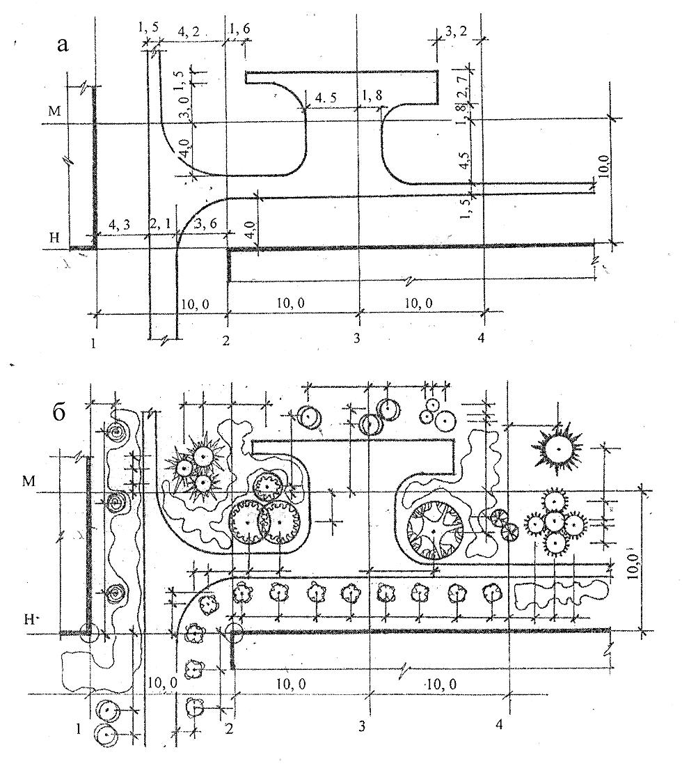 Рис. 13.10. Технический проект благоустройства: а – разбивочный чертеж плана озеленения; б – посадочный чертеж плана озеленения