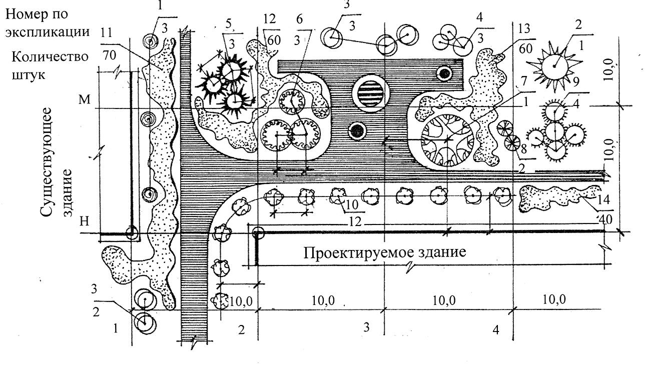Рис. 13.13. Пример чертежа проекта озеленения, разрабатываемого в проекте генерального плана: 1 – липа крупнолистная; 2 – ель колючая; 3 – клен остролистный;