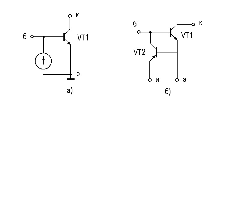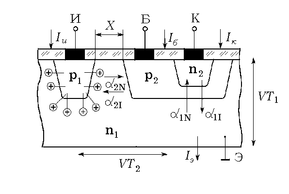 Если рассматривать транзистор с ИП не с точки зрения анализа физических процессов, протекающих в нем, а как законченную конструктивно – топологическую единицу, то последняя представляет собой четырехслойную структуру p1 – n1 – p2 – n2 – типа, в которой можно выделить два транзистора VT1 и VT2. Транзистор VT1 npn – типа с вертикальным расположением рабочих зон образован частью эмиттерной n1 – области, расположенной в ней базовой p2 – областью и коллекторной n2 – областью. Транзистор VT2 pnp – типа с латеральным расположением рабочих зон образован инжекторной p1 – областью, базовой n1 – областью и коллекторной p2 – областью. Как видно, n1 и p2 области выполняют одновременно функции соответственно эмиттера и базы, базы и коллектора.