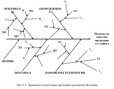 При построении диаграмм (рис. 6.1) в качестве главных факторов, определяющих качество продукции, учитываются так называемые 4М (первичные причины): material (материал) + machine (оборудование) + man (персонал) + method (параметры технологии), а также фактор «прочие». Эти причины являются, в свою очередь, следствием вторичных причин: М1, М2,... (для материалов и сырья); причин О1, О2,... (для оборудование) и т.д. Вторичным причинам могут соответствовать третичные причины и т. д. Например: