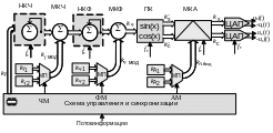 Модулятор кода амплитуды МКА представляет собой аппаратный перемножитель кода ординаты на код выходной амплитуды. Этот же узел используется для статической установки нужной амплитуды выходного сигнала или для стабилизации амплитуды выходного сигнала всего устройства формирования сигналов при использовании системы автоматической регулировки уровня мощности.