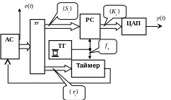 Для каждого из частичных отрезков определяются его длительность i и крутизна изменения ординаты Si. Массив данных об отсчётах сигнала {i, Si} записывается в запоминающее устройства ЗУ (см. схему на рис. 7.11). Тактовый генератор ТГ задаёт частоту fт тактирования процессов в таймере и реверсивном счётчике РС. В начале каждого частичного интервала в таймер из ЗУ переписывается код длительности интервала i, а в регистр счётчика РС – код крутизны Si. В каждый момент тактирования с частотой fт происходит добавление или вычитание числа Si к текущему значению кода Kt, который преобразуется в напряжение в преобразователе ЦАП. По истечении отрезка времени, определяемого величиной i, выходной импульс таймера увеличивает на единицу число в адресном счётчике АС, что приводит к вводу значений крутизны и длительности следующего частичного отрезка. Объём АС равен количеству N частичных отрезков. После переполнения АС возникает импульс e(t) начала цикла формирования, который можно использовать для сброса кода Kt в исходное положение или для организации автоматической подстройки размаха выходного сигнала макс u(t).
