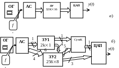 Рис. 7.9. Синтезатор сложного сигнала равноотстоящими во времени отсчётами (а) и представление его линейной аппроксимацией между узлами (б)