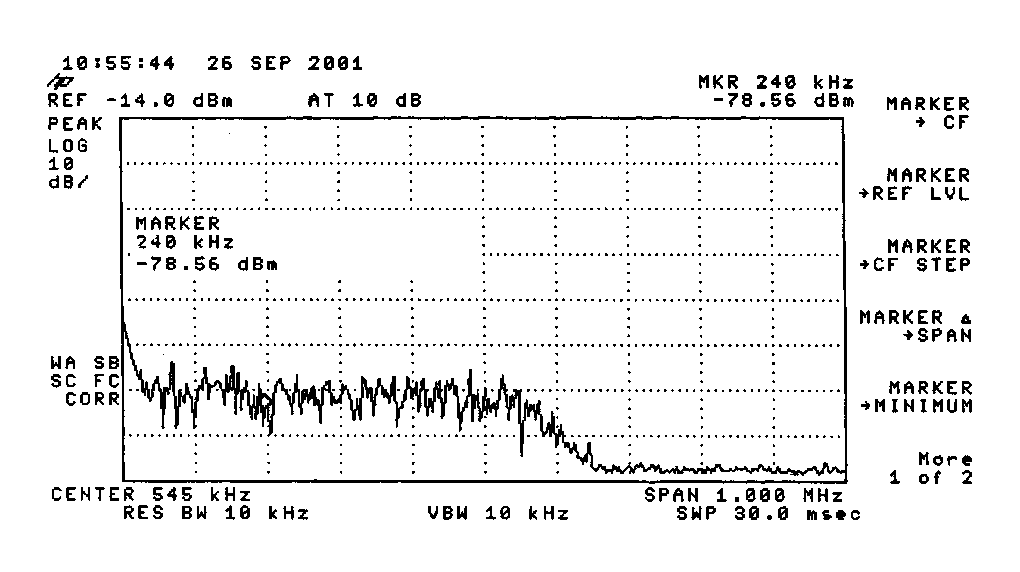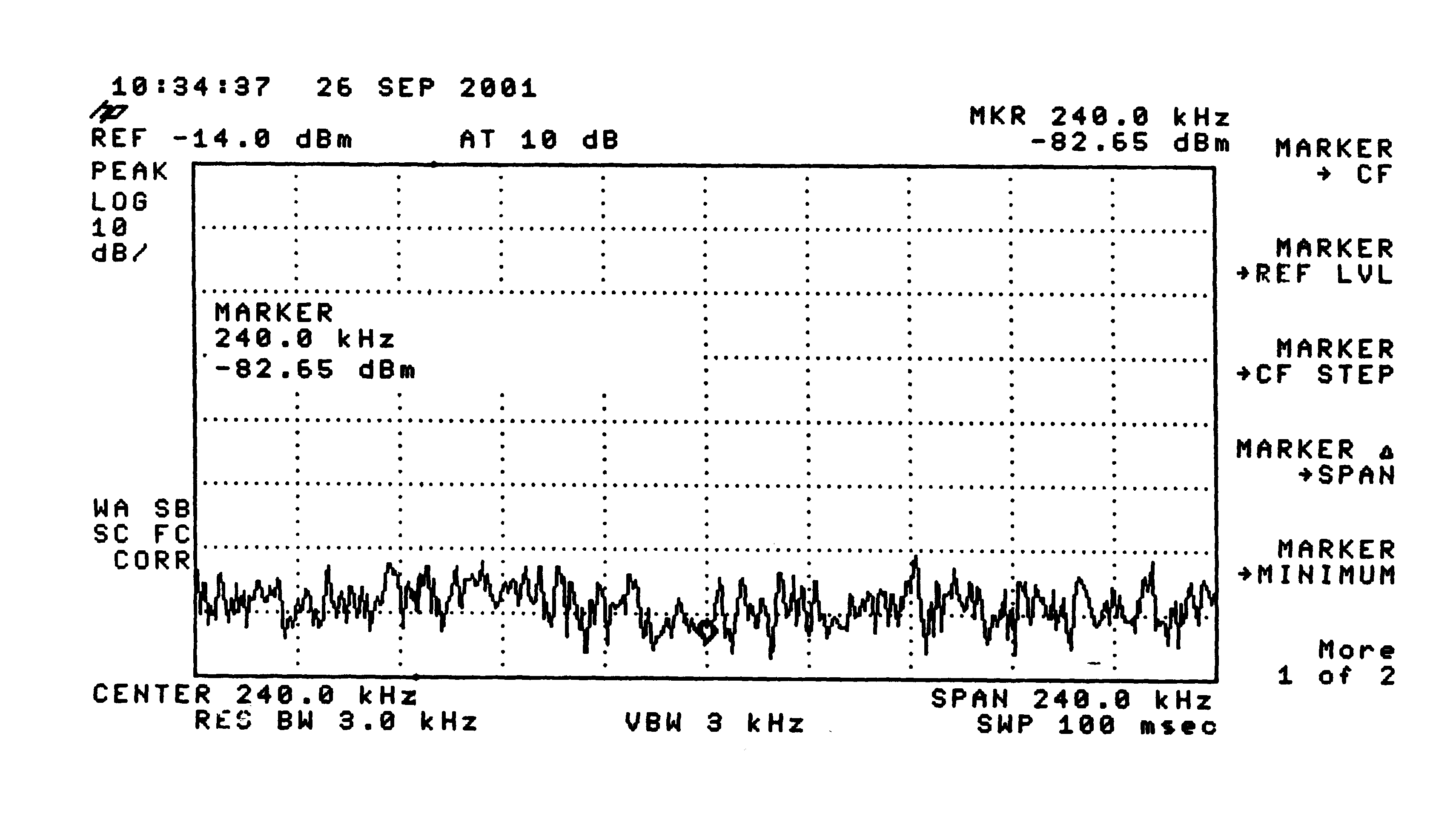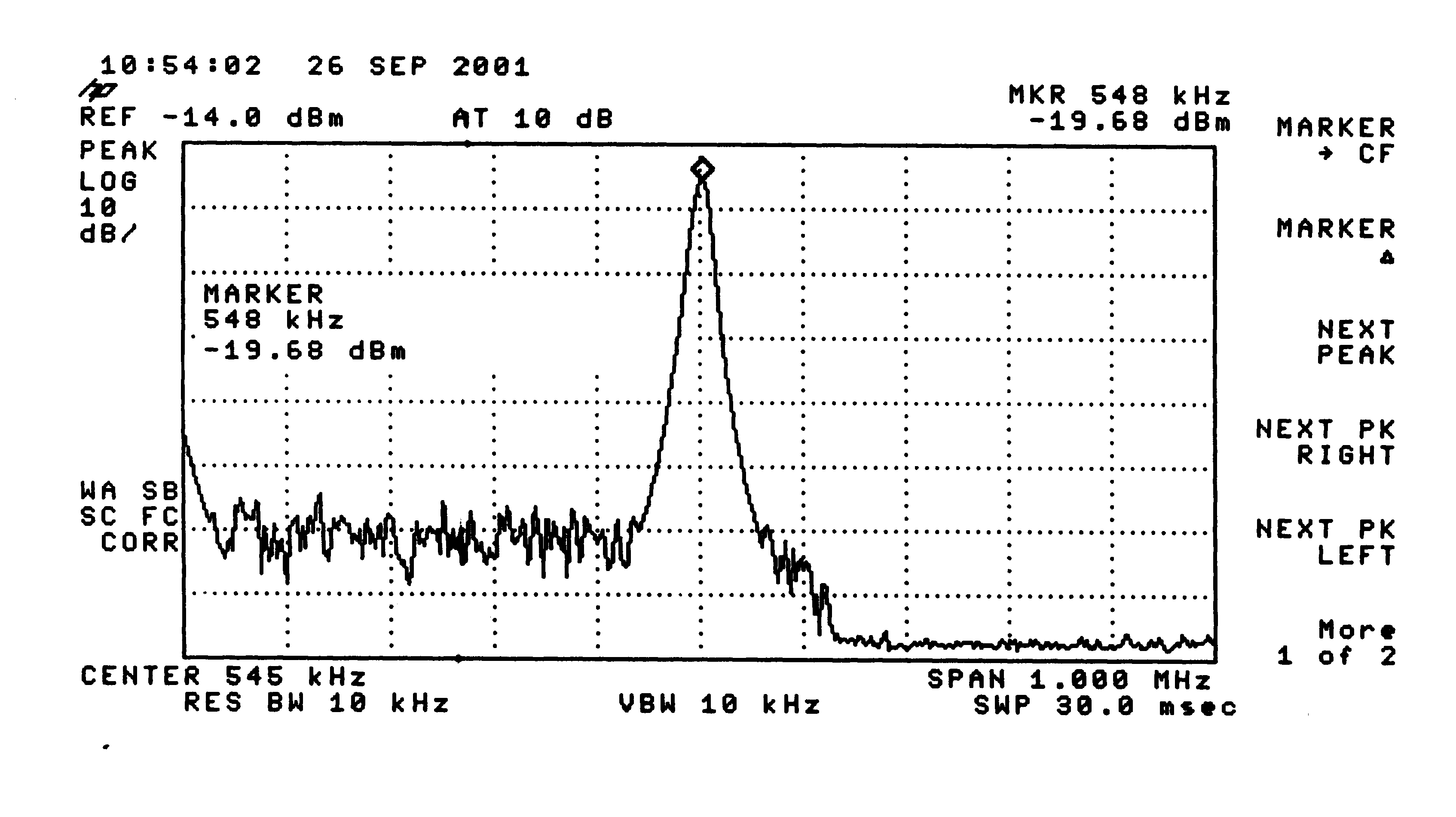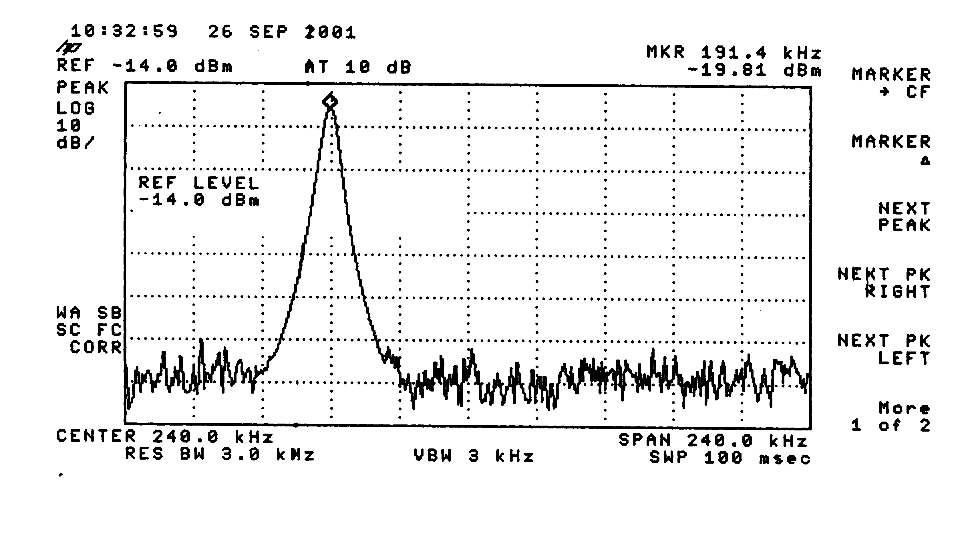 На рис. 4.16 и рис. 4.17 приведен спектр полезного сигнала и не подавленной УП при разной разрешающей способности анализатора спектра. Из рисунков видно, что уровень УП превышает уровень полезного сигнала на 60дБ.