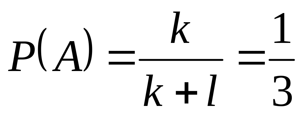 Пример 2.1. Из урны, содержащей k = 10 белых и l = 20 черных шаров (шары отличаются лишь цветом), наугад вынимают один шар. Требуется найти вероятность Р(А) события А, заключающегося в том, что из урны извлечен белый шар.