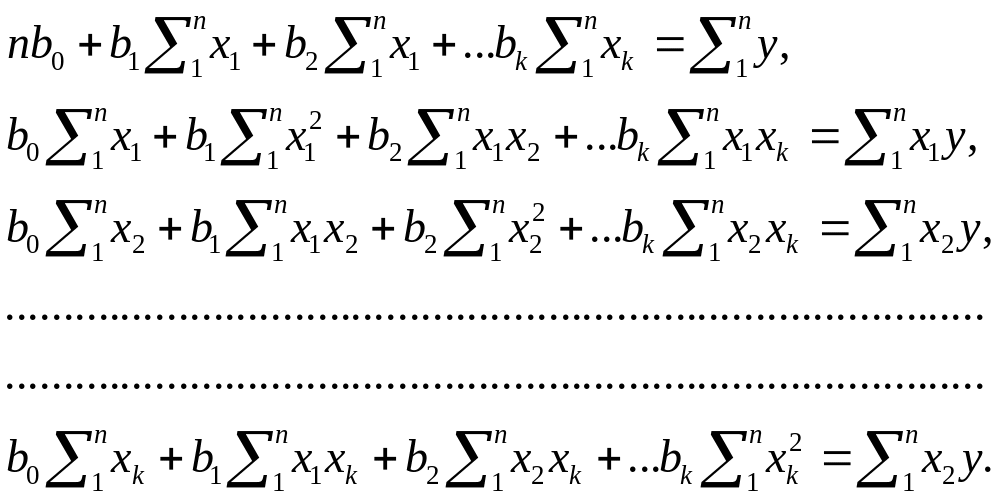 Для определения параметров уравнения (196), пользуясь методом наименьших квадратов, составляется система нормальных уравнений, которая в общем случае к переменных и объеме выборки n имеет вид