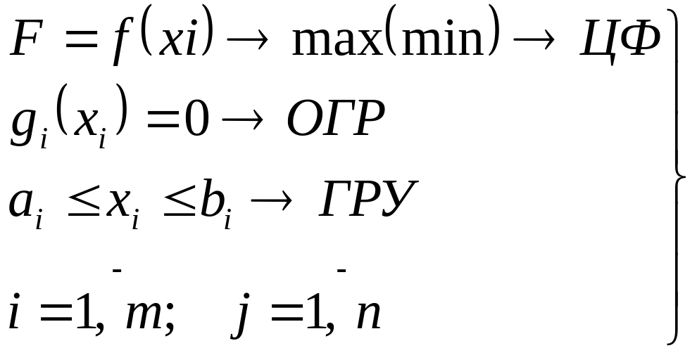 Примем, что если число некоторых переменных равно n, а m – число ограничений, то математической постановкой задачи оптимизации будет выглядеть следующим образом: