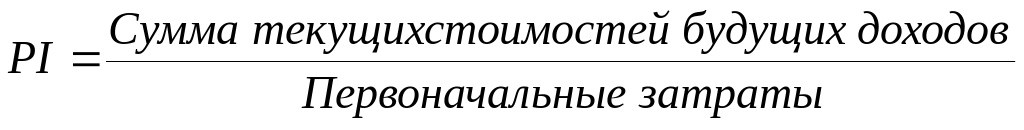3. Индекс рентабельности инвестиций (доходности) РI использует ту же самую информацию о дисконтированных денежных потоках, как и метод ЧДС. Однако вместо нахождения разницы между первоначальными затратами и текущей стоимостью будущих доходов РI определяет соотношение этих показателей. Общая формула выглядит так: