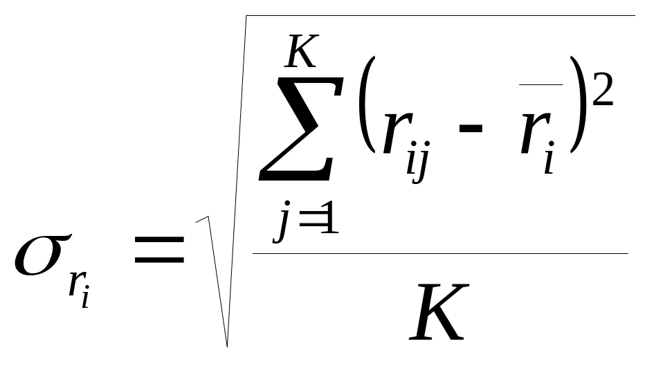 Среднее квадратичное отклонение (4.3), (4.4) измеряет отклонение (вариацию) показателей доходности отдельных акций и доходностей по рынку в целом от средних показателей и . В случае равенства вариации нулю показатель доходности не отклоняется от своего среднего значения, т.е. нет неопределенности, а значит, и риска. Величина вариации σ может считаться мерой неопределенности, т.е. мерой риска.