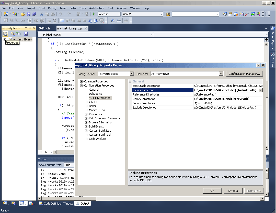 Полученный шаблон прикладной библиотеки достаточно просто перенести на другие среды разработки компании Microsoft-так, например, в версии Visual Studio 2010. NET необходимо переоткрыть проект, войти в раздел Property Manager (Менеджер разработки текущего проекта) и явным образом задать пути к папкам API SDK, содержащие разделы с lib (библиотеки разработки) и include (заголовки исполняемых функций) файлами. Все вышеописанные действия представлены на рисунке 5.