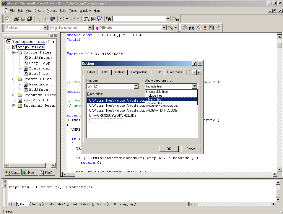 Для успешной компиляции и создания рабочего модуля библиотеки необходимо в файле «StdAfx.h» указать путь к директории, в которой находятся требуемые для успешной сборки проекта файлы (выделены жирным шрифтом). В среде разработки подключить заголовки (headers) c системными библиотеками (lib) SDK -в Visual C++6.0 «Tools->Options->Directories» и в разделе «Show directories for: Include files (Library files)» указать путь к соответствующим файлам, как показано на рисунке 2.