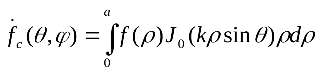 В случае круглой возбужденной поверхности радиусом а, расположенной в плоскости (хоу) с центром в начале координат в точке z=0, производится тем же методом, что и в случае прямоугольной поверхности. Однако при этом удобно использовать не прямоугольную, а полярную систему координат. Пусть ρ и φ′ — полярные координаты элементарной площадки (рис. 4.3) [2]: