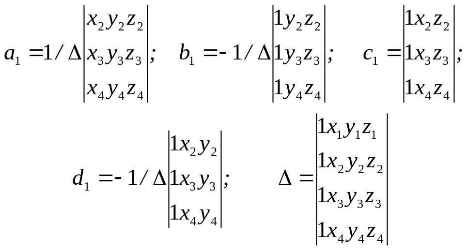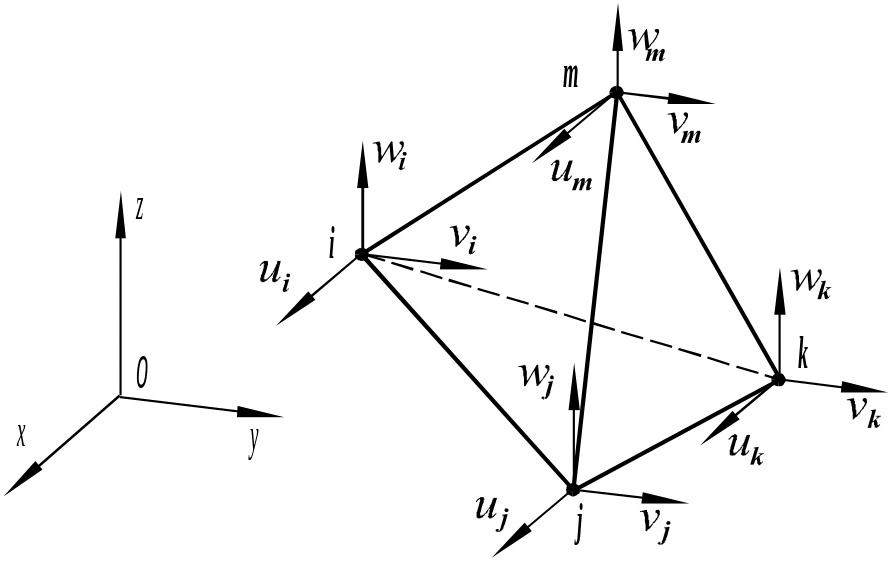 При построении модели используется конечный элемент в виде пирамиды с треугольным основанием. В качестве узлов i, j, k, m приняты его вершины (рис.59).
