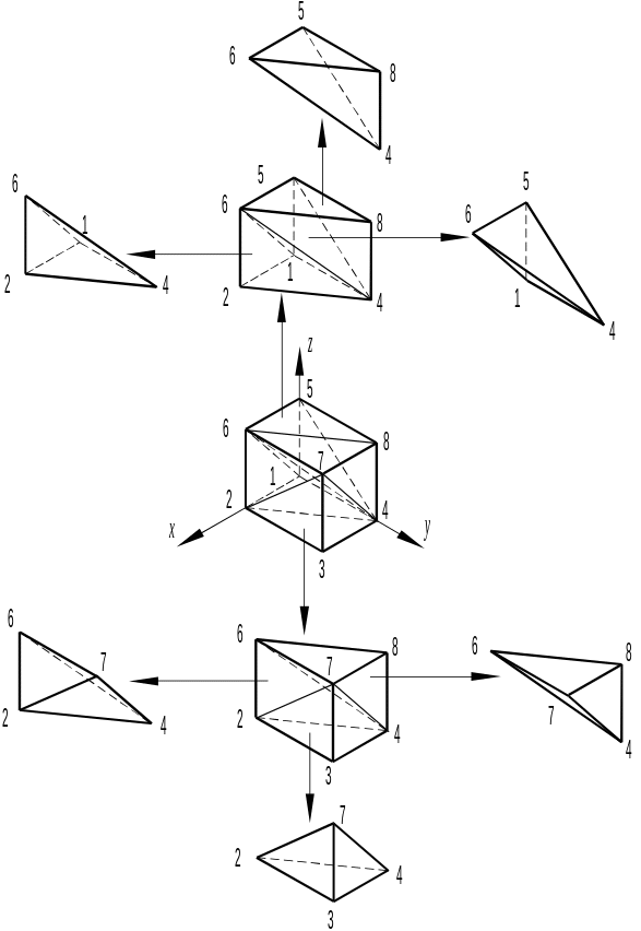 Рис. 61. Схема разбиения четырехгранной призмы на тетраэдры