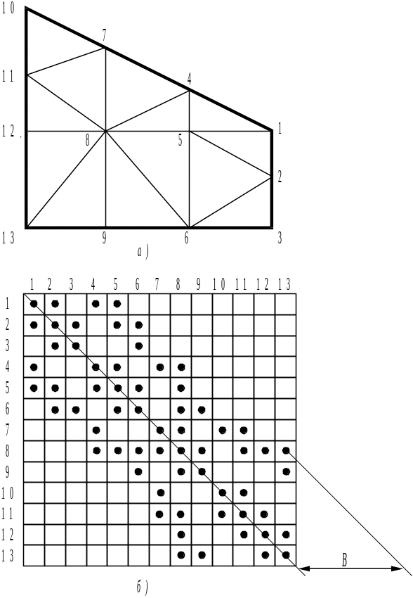 Рис. 4. Пример сетки (а) и схемы размещения ненулевых коэффициентов глобальной матрицы жесткости (б)