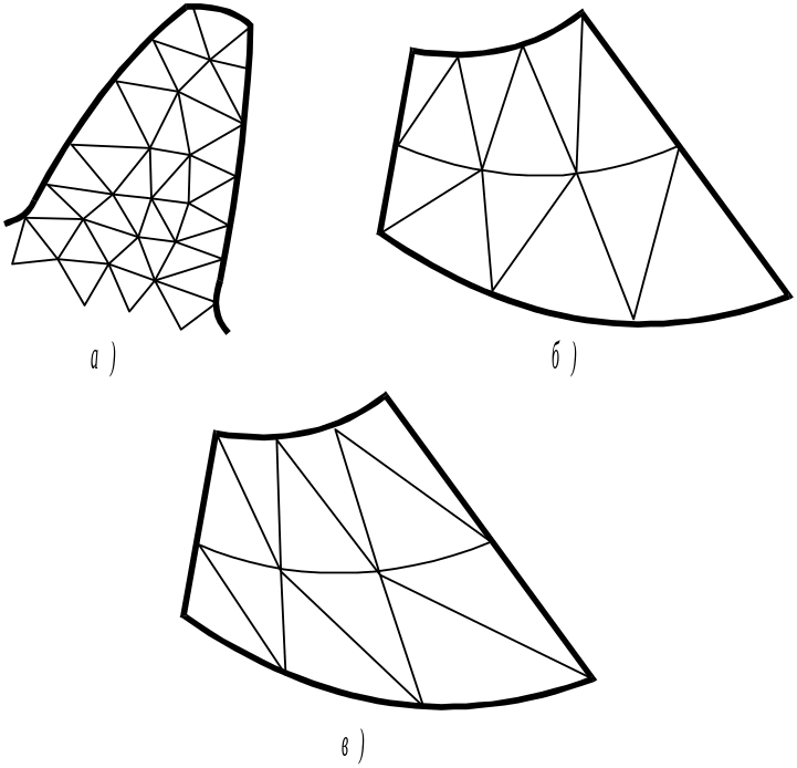 При разбиении области на треугольные элементы, вначале делят ее на четырехугольные подобласти, которые затем делят вдоль короткой диагонали на два треугольных элемента (рис. 1, б). Нежелательным разбиением является показанное на рис. 1, в, так как элементы, близкие по форме к равностороннему треугольнику, дают более точные результаты, чем длинные узкие треугольники.