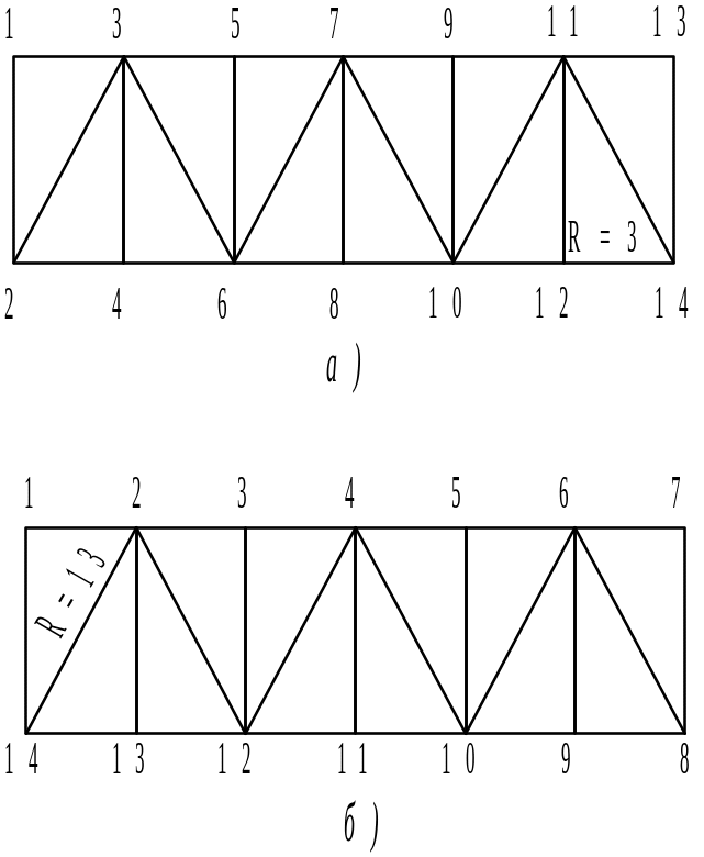 На рис. 5, б изображена зона с неэффективной нумерацией узлов (здесь наибольшая разность между номерами узлов равна R=13). Если в каждом узле рассматривается по две степени свободы, то при правильной нумерации машинная память для примера рис. 5, а сокращается более чем на 80%.