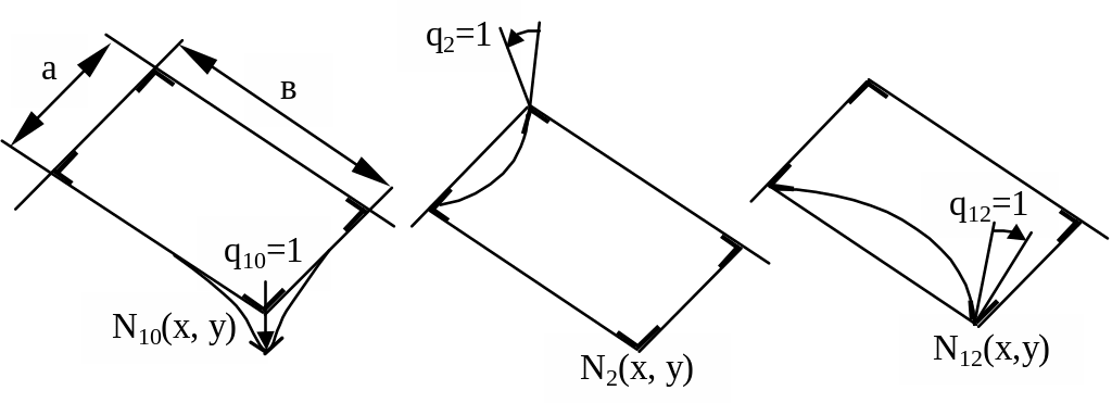Функция Nj(x,y) показывает распределение прогибов, вызванных в элементе узловым перемещением qj = 1, при условии, что все остальные узловые перемещения отсутствуют (рис.39).