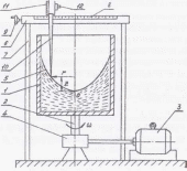 Лабораторная установка (рис. 9) состоит из открытого круглого цилиндрического сосуда 1, днище которого закреплено на вертикальном валу 2, расположенном на оси симметрии сосуда. Сосуд, наполненный примерно на половину водой, приводится во вращение с постоянным числом п оборотов в минуту электродвигателем 3 через передачу 4. Определение координат свободной поверхности 5 производится с помощью координатника 6, закрепленного на неподвижной раме 7 прибора. По горизонтальным направляющим с миллиметровой шкалой 8 с помощью винта 9 перемещается каретка с измерительной иглой 10. Игла может перемещаться по вертикальным направляющим с миллиметровой шкалой 11 и фиксироваться винтом 12. Для отсчета горизонтальных и вертикальных координат на каретке и игле нанесены риски.