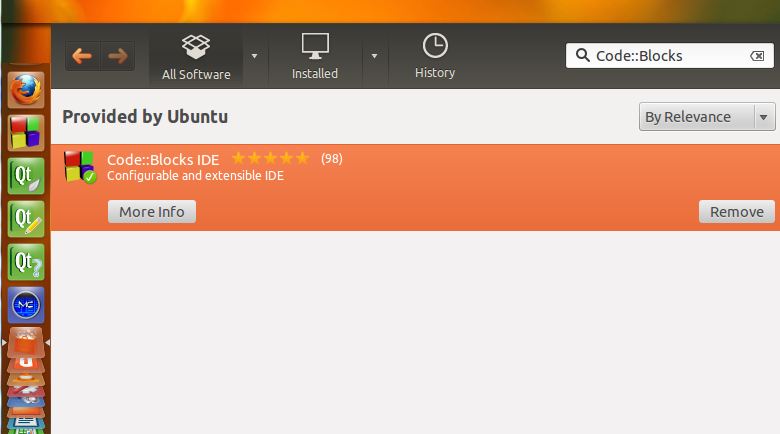 Создать приложение в IDE средах под Linux с использованием glut проще и эффективнее, если есть уже настроенная производственная среда разработки. Мы будем ориентироваться на IDE Code::Blocks-среда, которая доступна для установки из цента установки программного обеспечения Ubuntu. Выбираем вкладку по обновлению ПО и в строке поиска указываем название продукта C::B, затем производим установку (рисунок 5). Надо отметить, что IDE установится при условии доступа к сети Internet. На рисунке 5 отмечено, что приложение можно только удалить, что означает следующее - IDE установлена в системе и готова к работе. Установка отдельных элементов среды, если по каким-либо причинам они не были развернуты в системе, производится следующим образом: