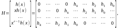 где h0, h1, … - коэффициенты полинома h(x), называемого проверочным полиномом.