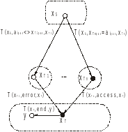 1. В интервале времени (n): Злоумышленник, используя клиенты xTii[1…n], расположенные на разных удалённых хостах, посылает запросы на установление рабочего соединения c сервером xs. Каждый клиент передаёт пароль (pas), полученный, через объект злоумышленника xT, из базы данных y (здесь они и генерируются). На сервере осуществляется проверка правильности пароля. Модель процесса изображена на рис. 5.4.