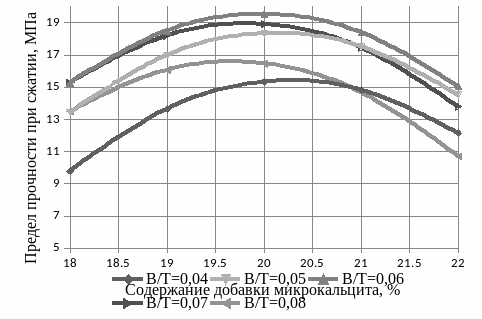 Оценку совместного влияния добавок и водотвердого отношения на свойства гипсовых систем негидратационного твердения проводили на образцах-цилиндрах с высотой и диаметром 50 мм, изготовленных методом полусухого прессования с использованием давления 30 МПа и испытанных на 7 сутки. Твердение образцов осуществлялось в эксикаторе над водой. Содержание добавок микрокремнезема и микрокальцита варьировалось от 0 до 20 % от массы двуводного техногенного гипса, водотвердое отношение (В/Т) в пределах 0,06…0,24. Критерием оценки влияния добавок на свойства гипсового композита была принята прочность и плотность материала.